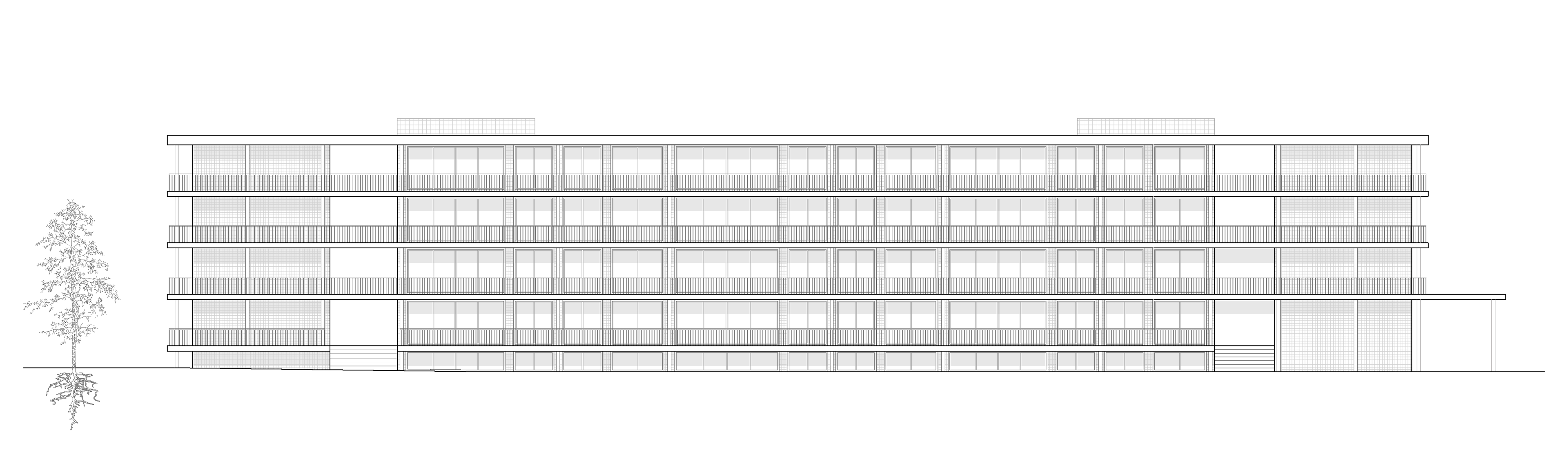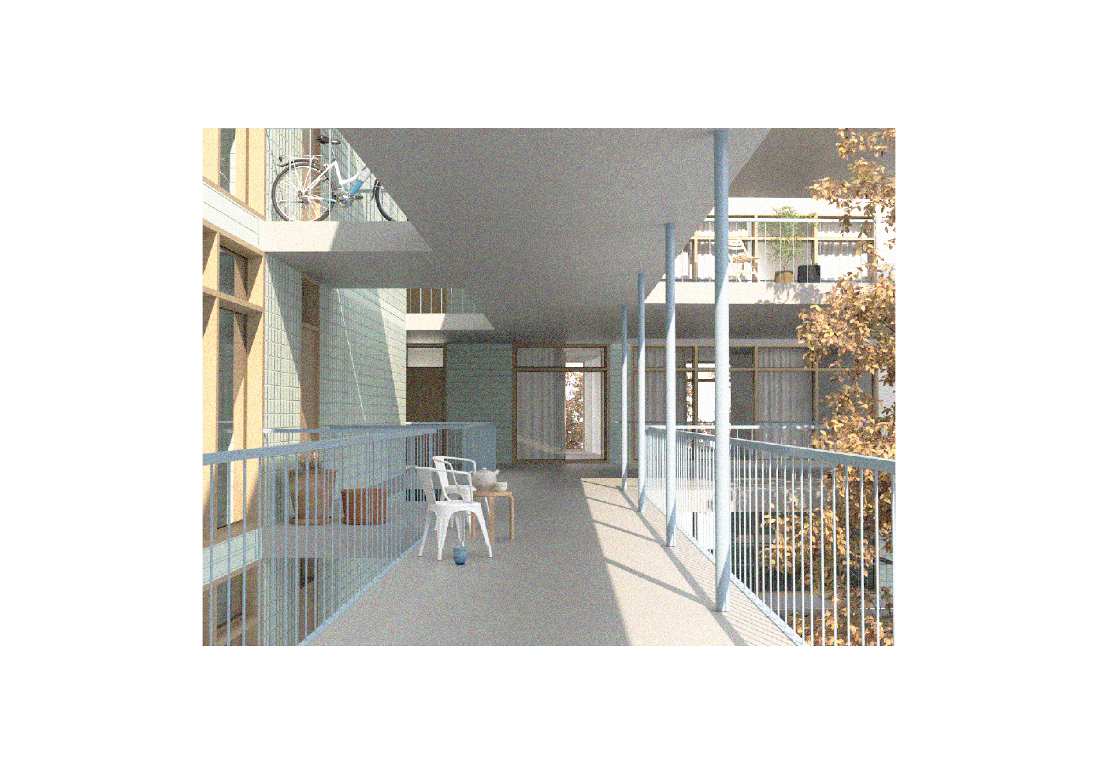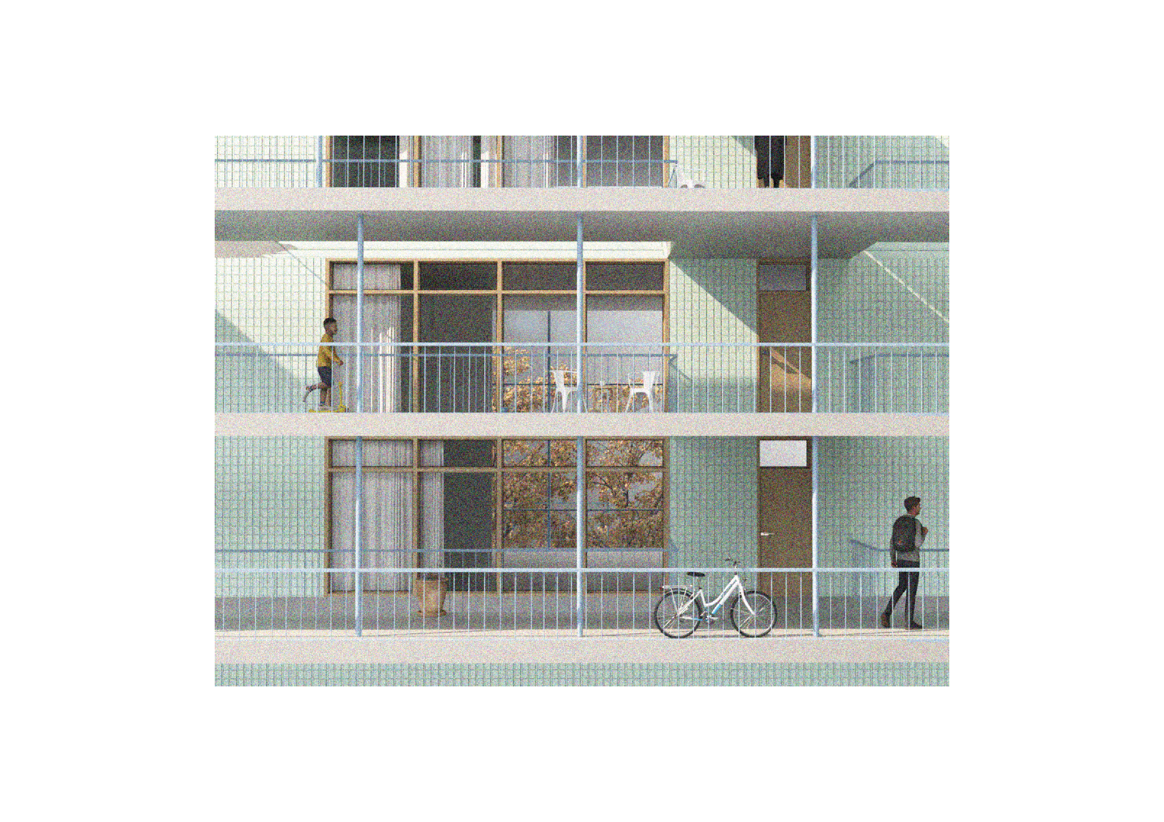 The gallery’s generous width transforms it into a semi-public social space, designed to facilitate informal interactions and nurture a sense of community. While the apartments are equipped with private balconies on their external facades, the gallery functions as an inward-facing shared balcony, offering residents a communal, transitional space that blurs the boundaries between private and public.