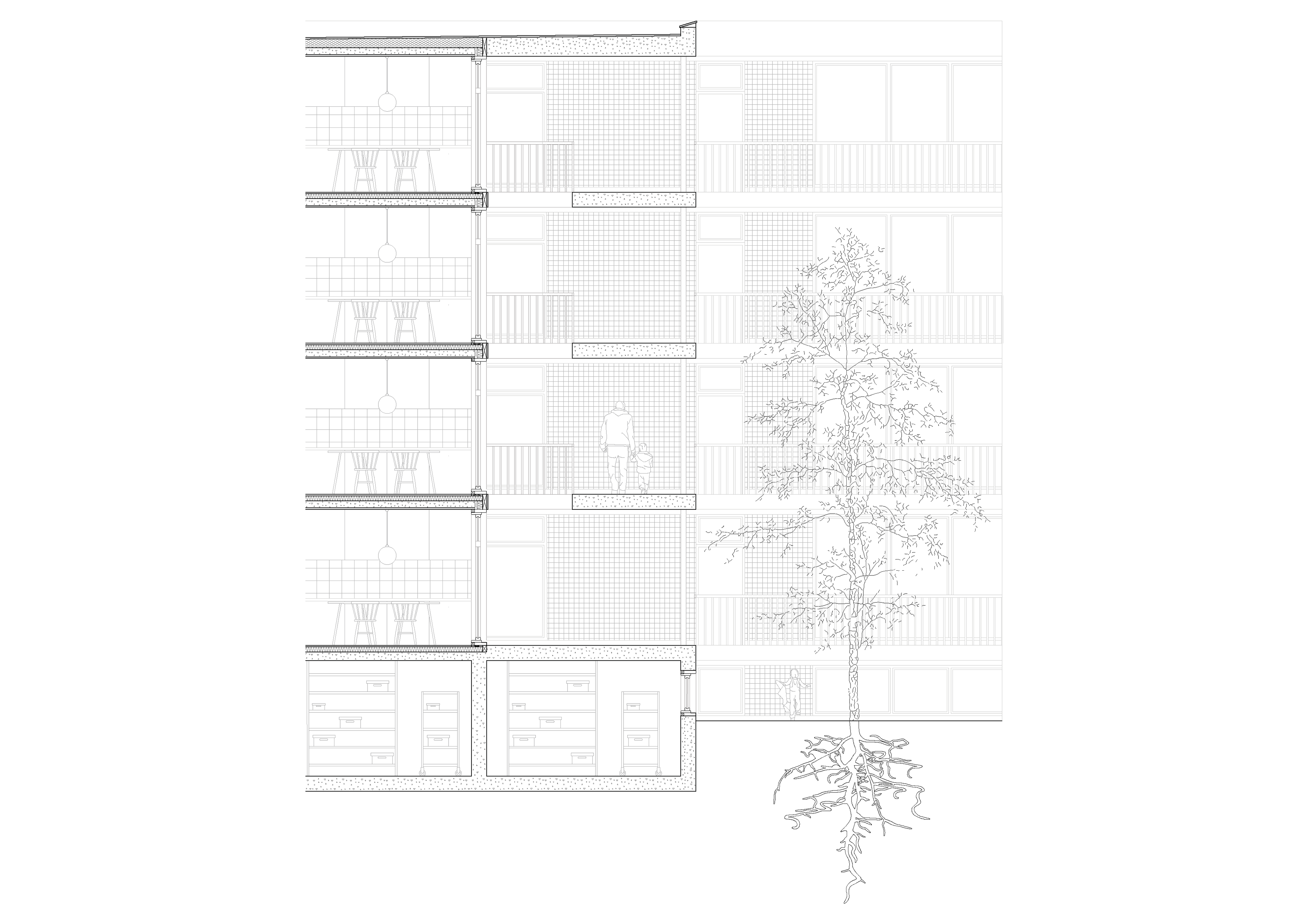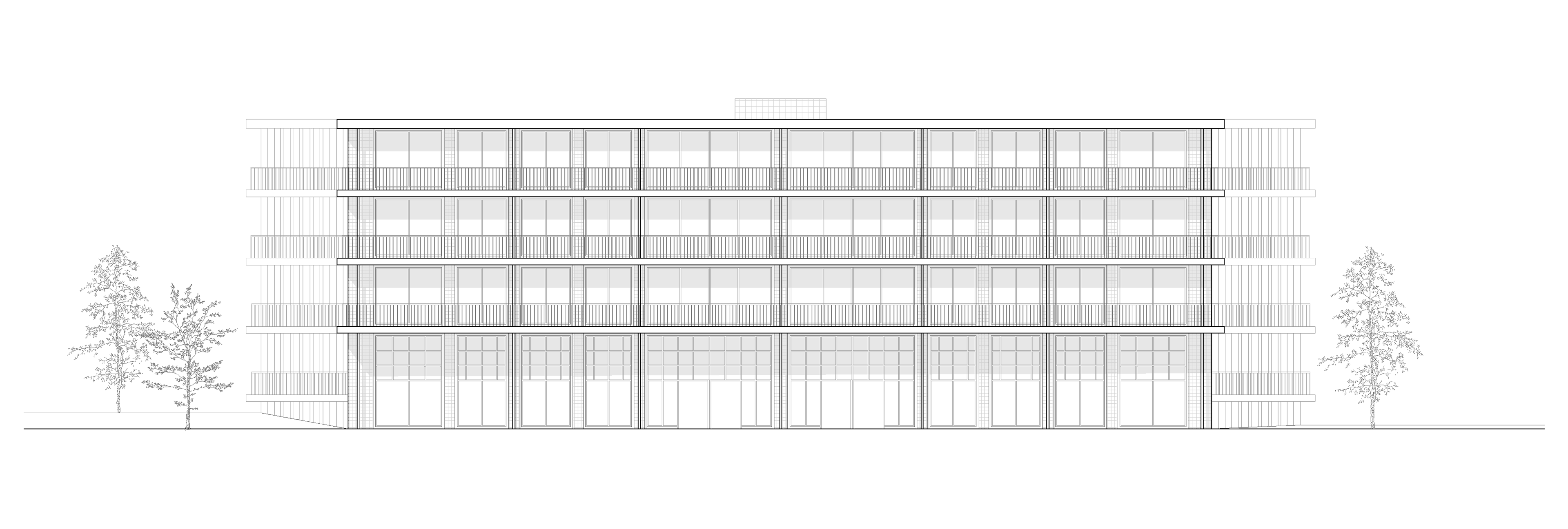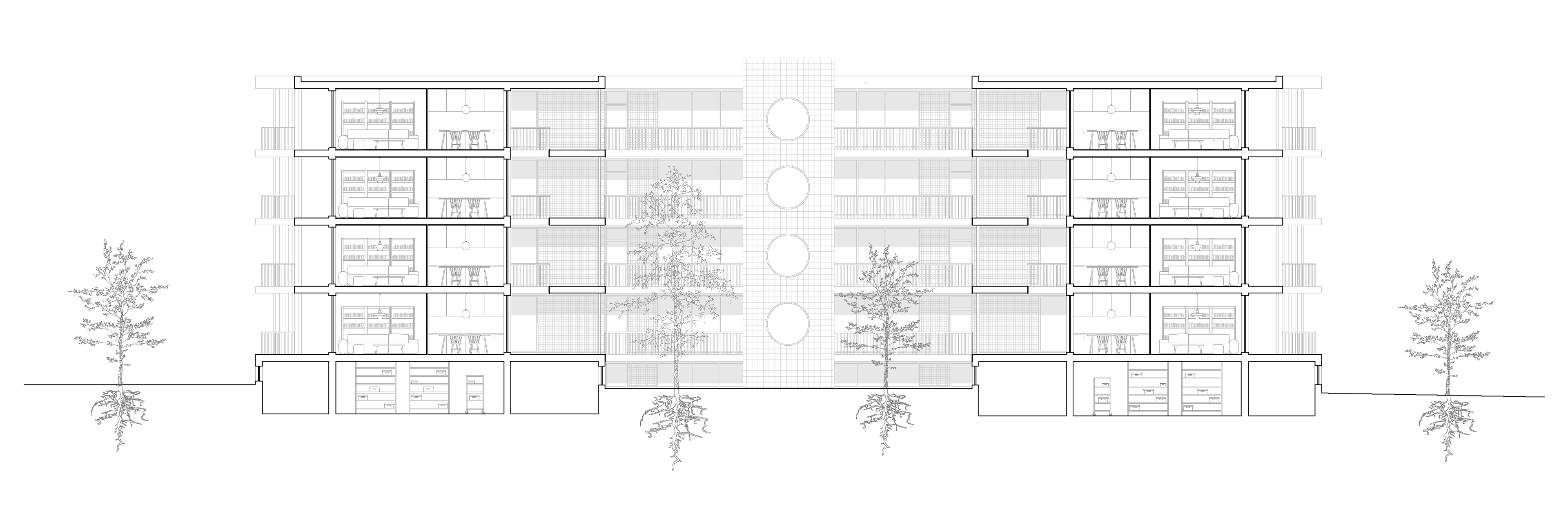 The gallery’s generous width transforms it into a semi-public social space, designed to facilitate informal interactions and nurture a sense of community. While the apartments are equipped with private balconies on their external facades, the gallery functions as an inward-facing shared balcony, offering residents a communal, transitional space that blurs the boundaries between private and public.
