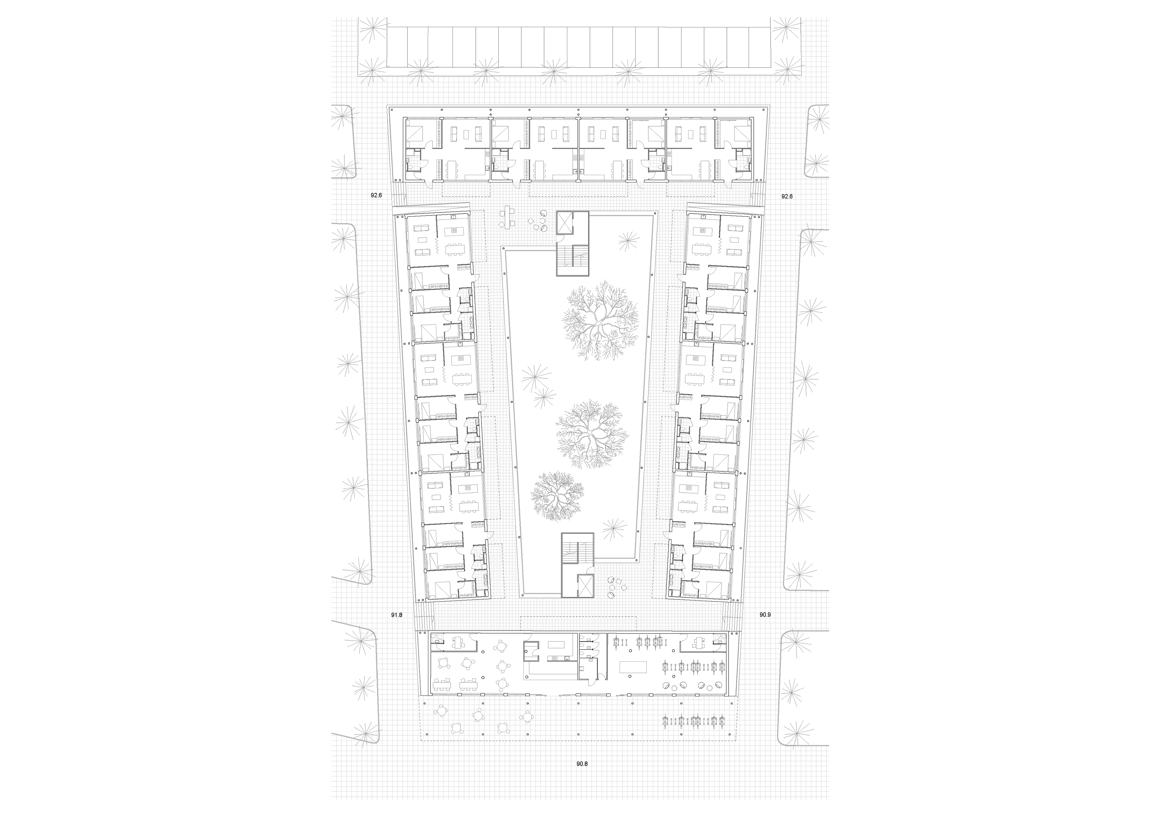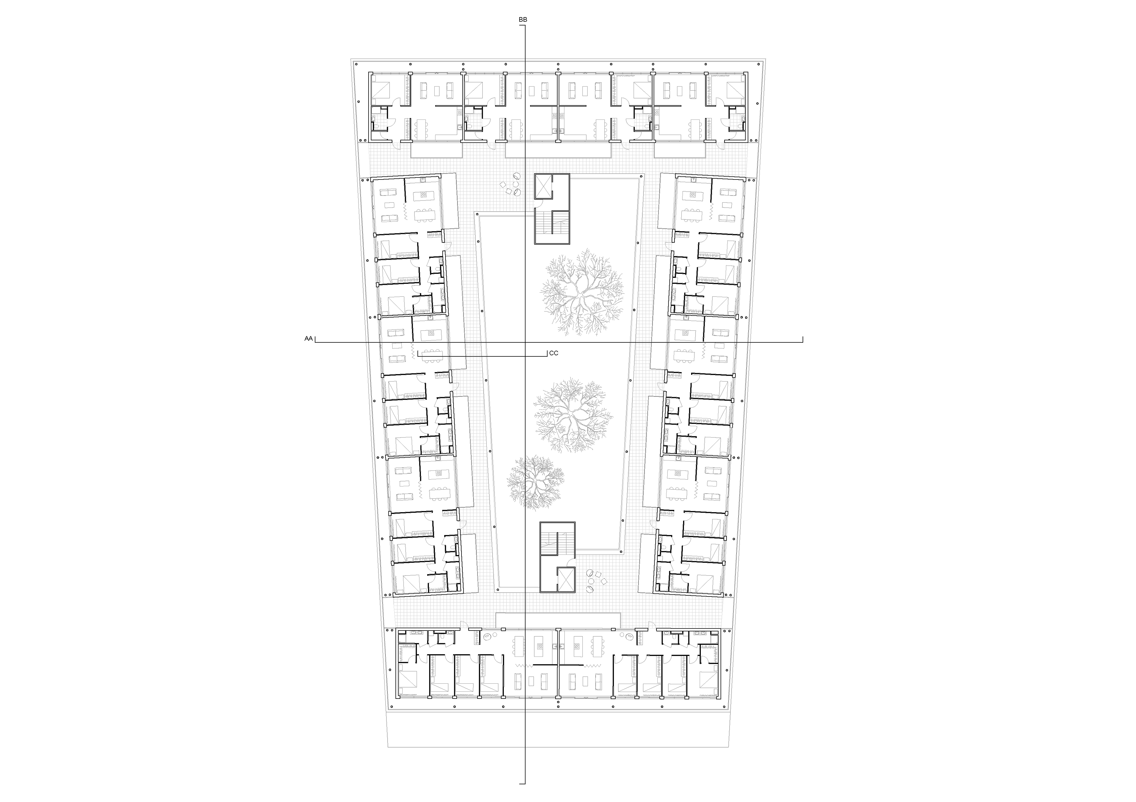 The project envisions an urban block composed of four distinct buildings interconnected by a gallery, with stair towers positioned at either end of a central courtyard. The residential program offers apartments of 70, 100, and 130 square meters, with entrances distributed across four strategically placed access points. The ground floor, oriented towards a communal square, incorporates a café and a bicycle shop to foster neighborhood activity and engagement.