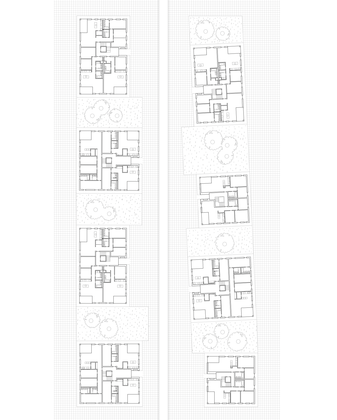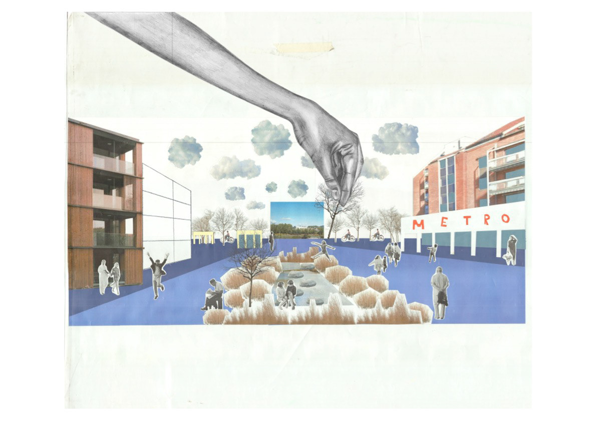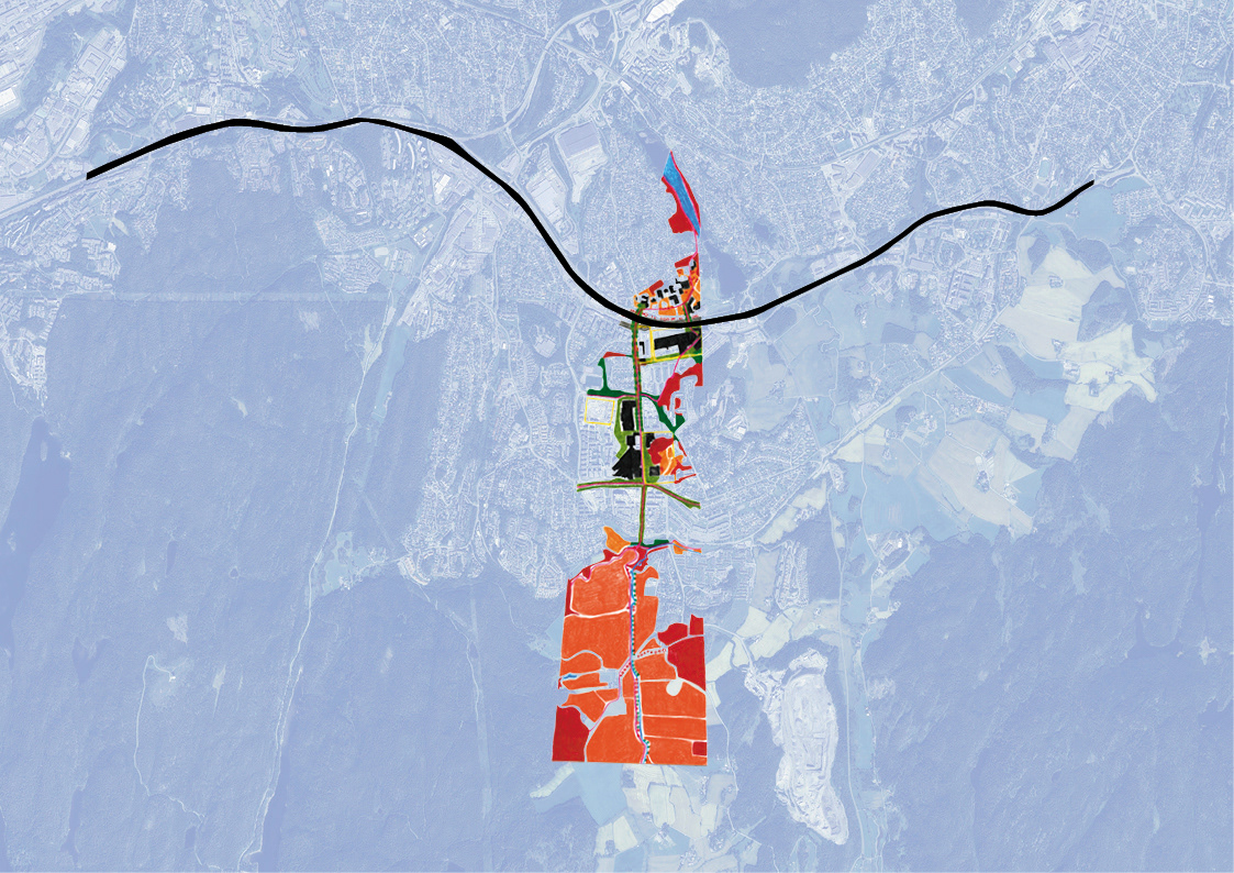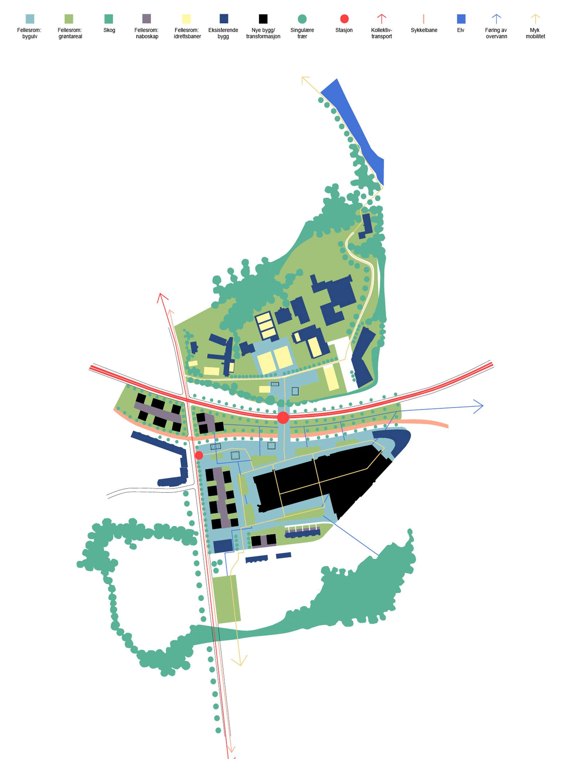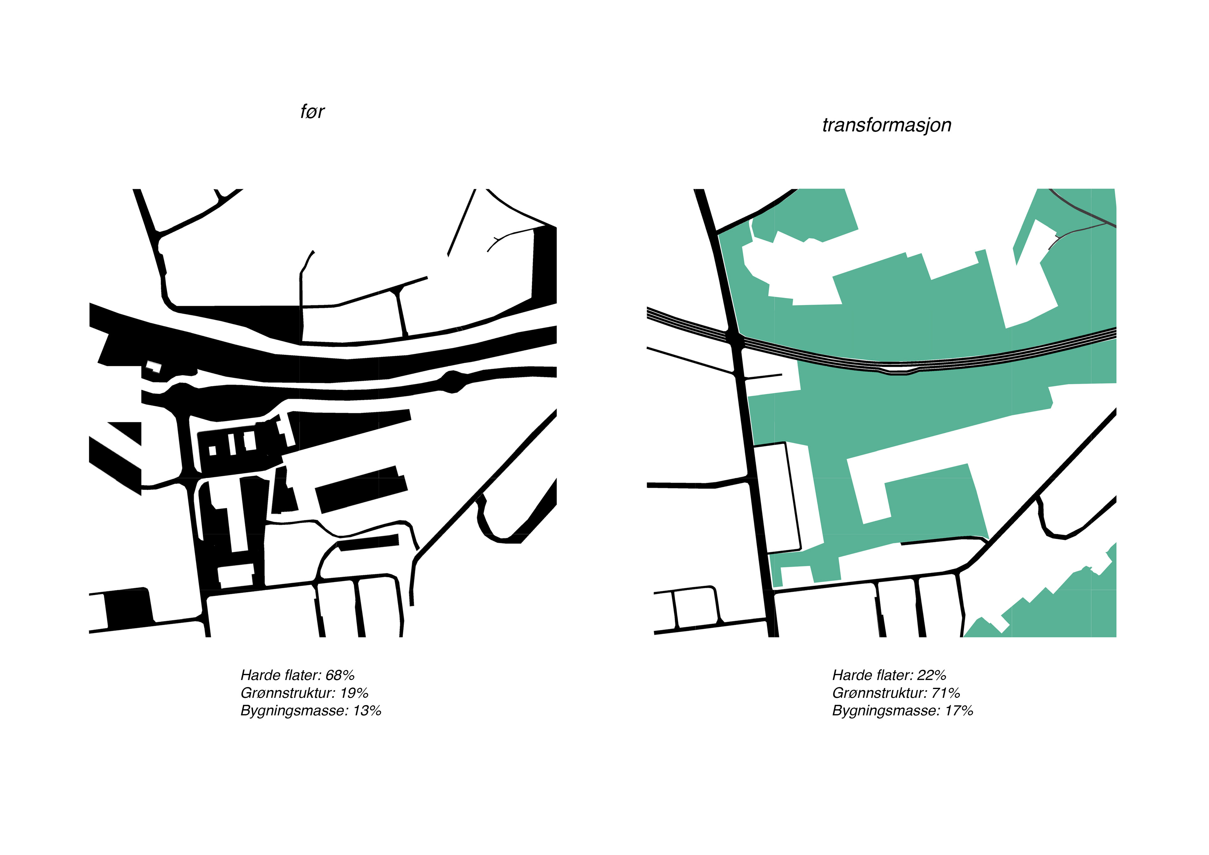 The proposed transformation of Lørenskog center presents a solution to the social, ecological, and economic challenges faced today. The connection of the north and south over RV159, the extension of Skårersletta north to Kjenn, and the addition of a pedestrian crossing with a signal bus station placed centrally within the area address the physical and social division caused by today’s situation of RV159. Welcoming and active public spaces at Kjenn have also been created by restructuring the surfaces and the sports fields to be clearly public. Metro center is transformed by creating an open and accepting public area with after-school activities, lounges, cafes, and bars, as well as an open park surrounding the perimeter of the center. These design solutions bridge the divide of social and economic differences, creating an inclusive and well-functioning city center. Before the transformation, roads and hard surfaces dedicated to cars occupied, on average, 68% of the space, while green structures had 19% of the space. After the transformation, roads and hard surfaces occupy 22% of the space, and green structures/ecology cover 71% of the space. A solution to housing in the area is also provided by placing 19 condominiums that offer 48 housing units within the space. This offers an alternative typology to the current trend of development. These additions also contribute life and activity to the area.