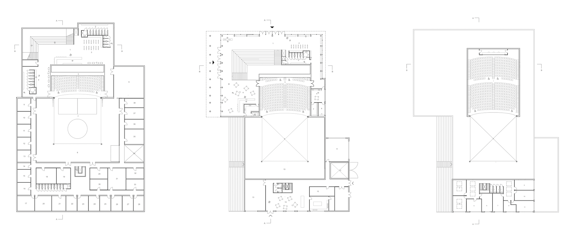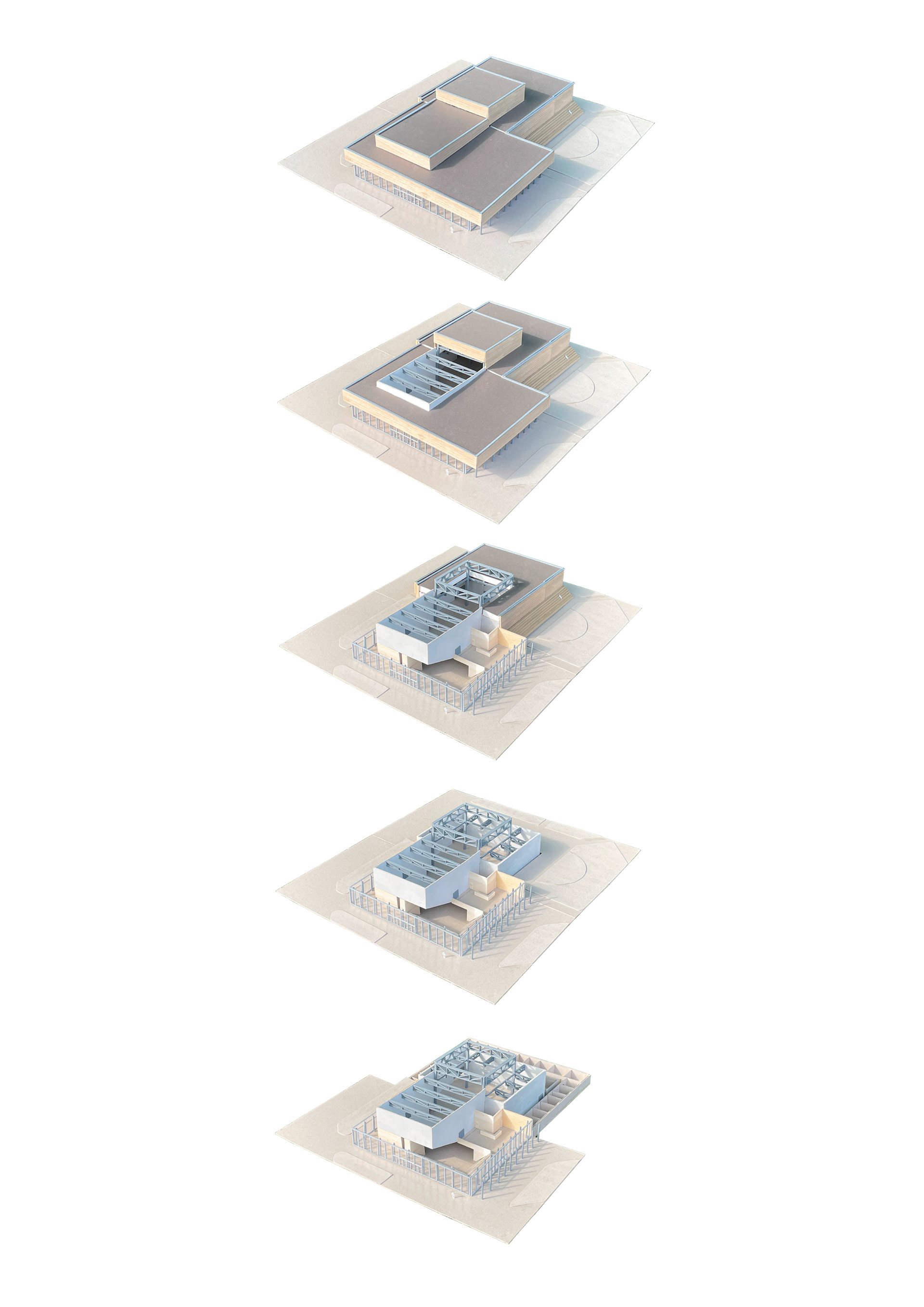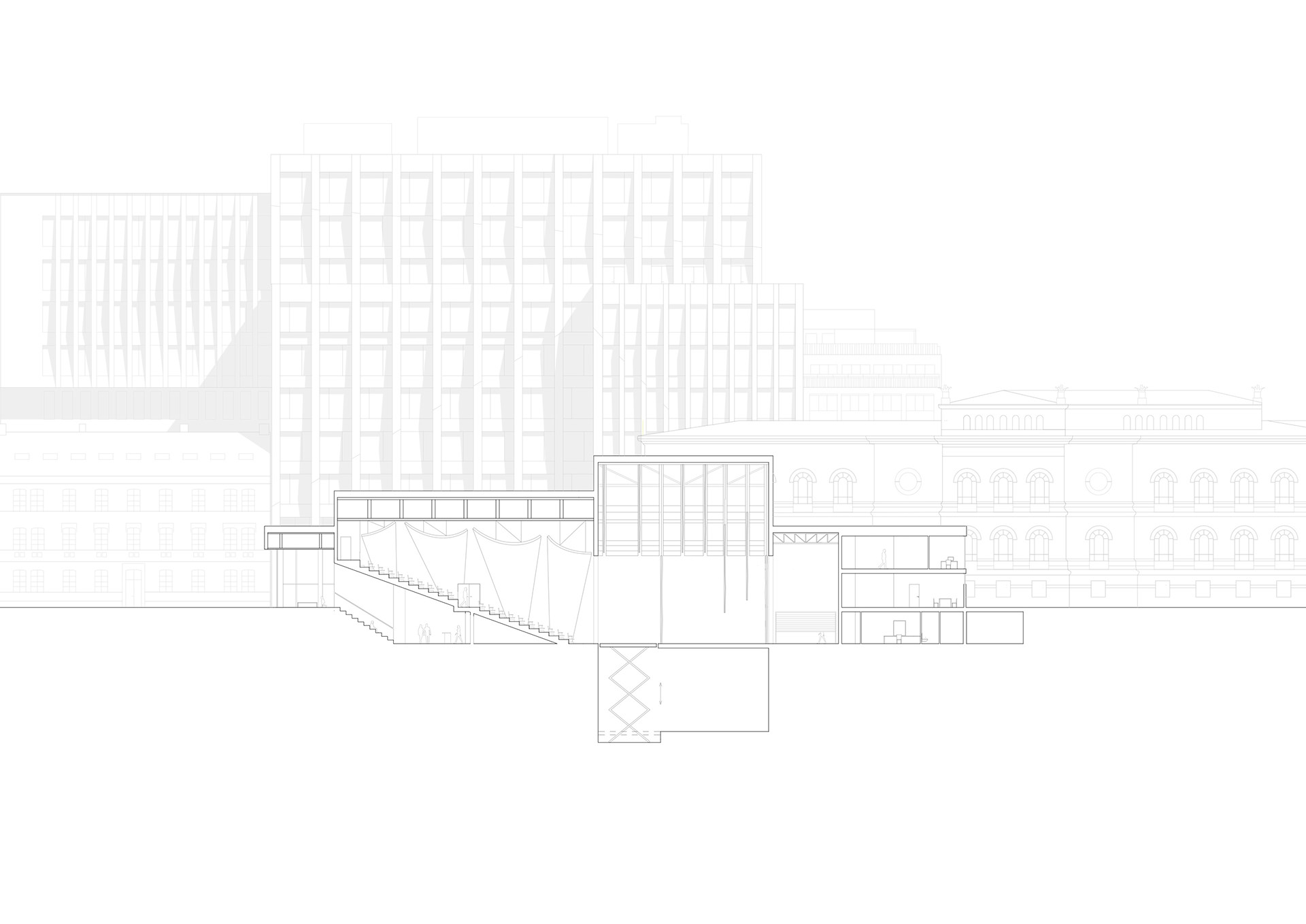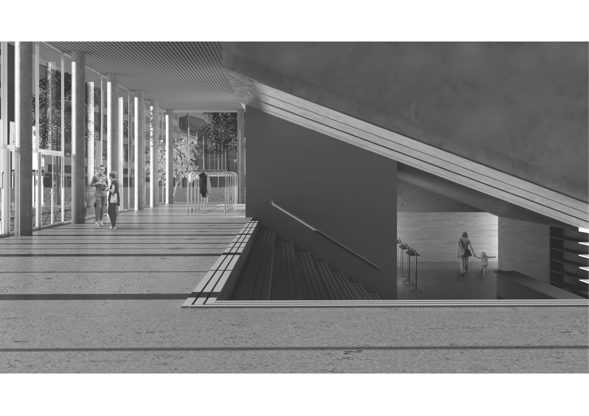 The open foyer with an amphitheater cultivates a relaxed ambiance, encouraging diverse audiences to engage. An all-day café ensures the National Theatre remains a vibrant hub beyond scheduled events. The amphitheater seamlessly extends outdoors to the west, connecting the foyer to the surrounding environment. For optimal functionality, the Back of House faces south, optimizing natural lighting. Staff benefit from a separate entrance and an outdoor area. A shared stairwell and canteen encourages interaction among staff across various roles.