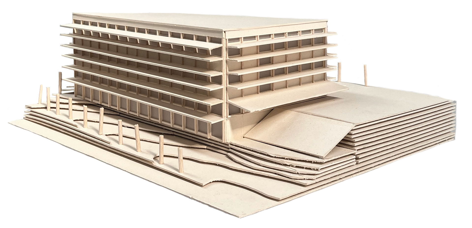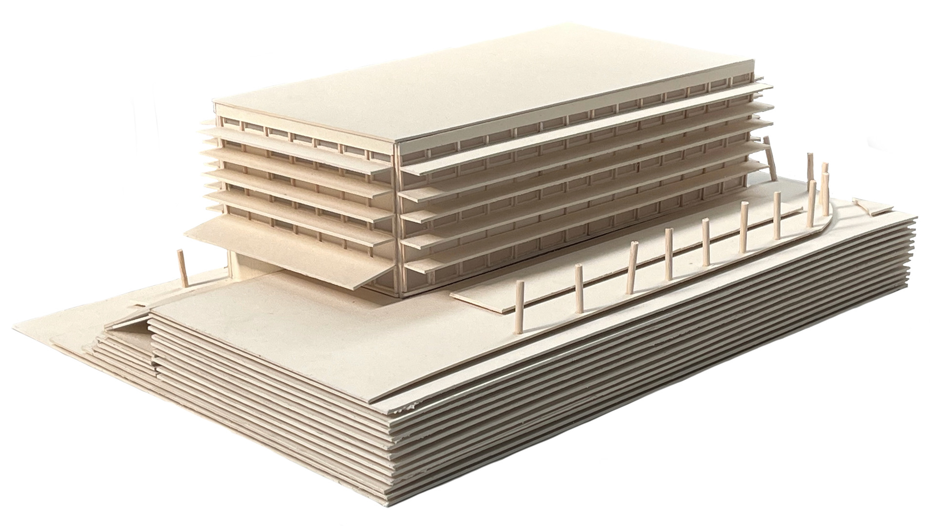 Structurally, the project is organized around a regular 5-by-5-meter steel grid of columns, establishing a clear spatial rhythm throughout the building. This structural clarity allows for flexibility and adaptability in programming while maintaining a strong architectural order. In the first floor, programmatic volumes - such as the reception, restaurant, shop, library, and cinema - are placed as independent boxes within this grid. These volumes wrap around and weave between the columns, reinforcing the grid’s presence while also negotiating with it. To soften the strictness of this system, curved and circular shapes are introduced in certain parts of the floor plan, creating moments of spatial relief and visual contrast.