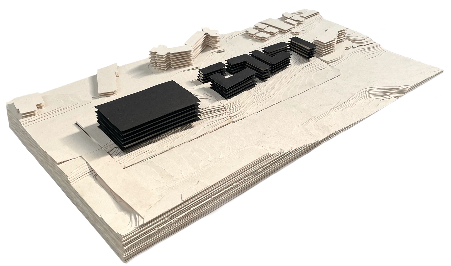The surrounding landscape is an integral part of the design. To the south, the building opens onto a new public square - a shared civic space developed in the group planning phase. In contrast, the west and north edges are bordered by denser vegetation, creating a more sheltered, introspective edge. To the east, a “path of play” activates the site with informal recreational spaces, reinforcing the building’s focus on activity and movement.