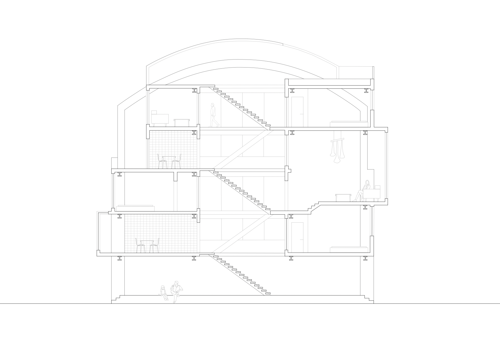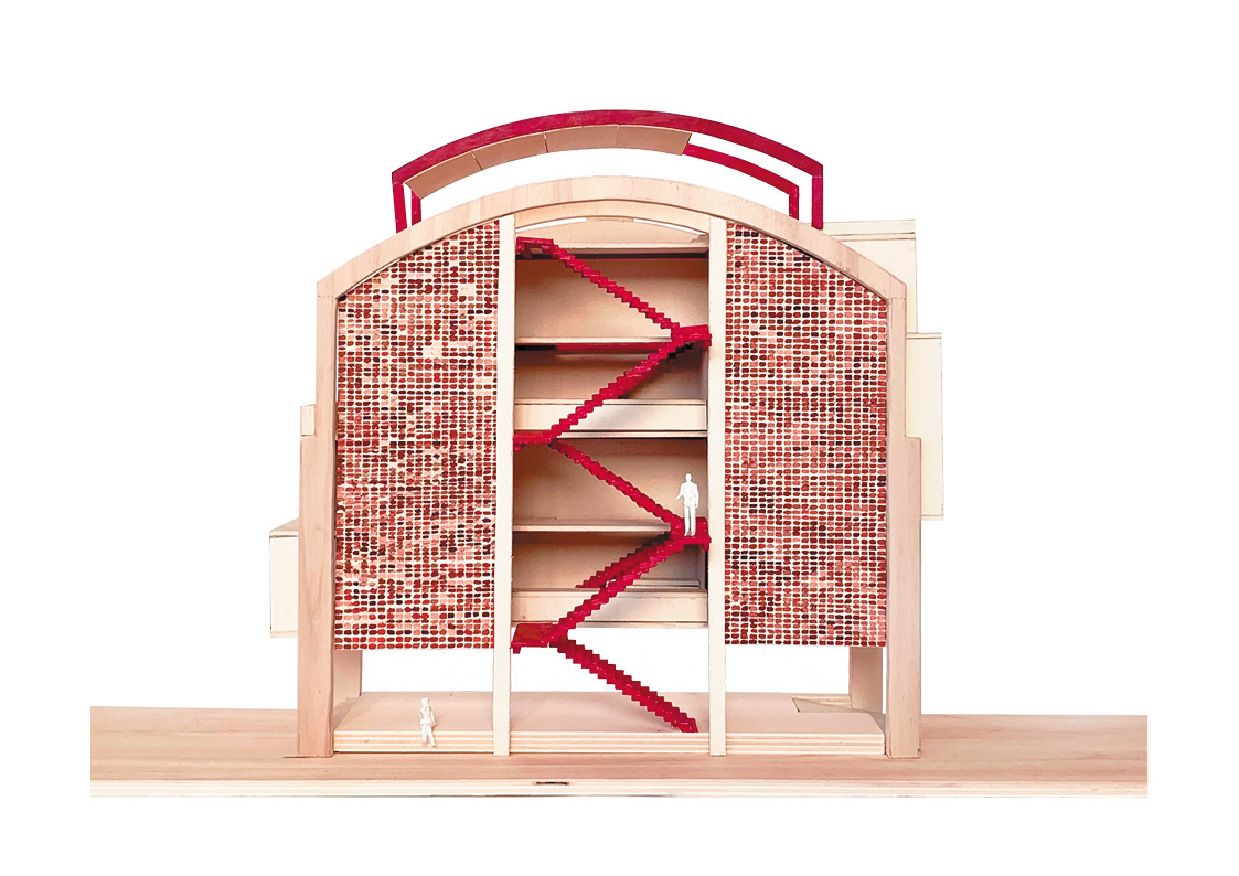 The old steelfactoryhalls at Ensjø in Oslo were slated for demolition to make way for new apartment complexes. This project explores the possibility of preserving the steelfactoryhalls and transforming them into townhouses. The concrete structure with its distinctive arch is retained, along with the existing brick facade. A red steelbeam construction has been added to support the new floors of the house.