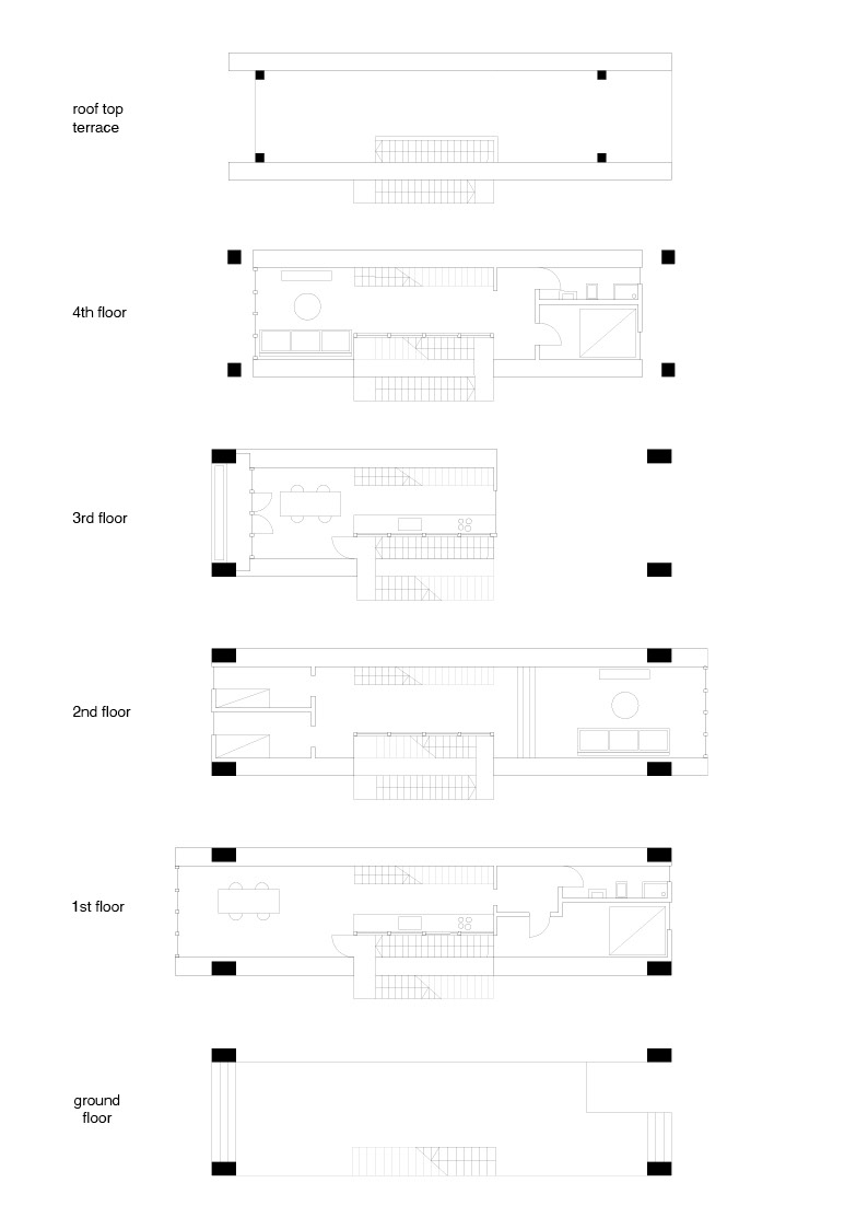 The residence is designed for two families. The first two floors are allocated to one family, while the other two floors belong to the second family. Together, they share the ground floor and a rooftop terrace.